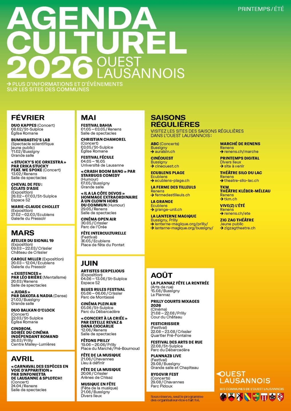 Les rendez-vous culturels de l'Ouest lausannois, répertoriés sur un seul document.